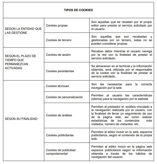 Una Cookie es un fichero que se descarga en su ordenador al acceder a determinadas páginas web. Las cookies permiten a una página web, entre otras cosas, almacenar y recuperar información sobre los hábitos de navegación de un usuario o de su equipo y, dependiendo de la información que contenga y de la forma en que utilice su equipo, pueden utilizarse para reconocer al usuario. Las cookies son esenciales para el funcionamiento de internet, aportando innumerables ventajas en la prestación de servicios interactivos, facilitándole la navegación y usabilidad de nuestra web. La información que le proporcionamos a continuación, le ayudará a comprender los diferentes tipos de cookies: